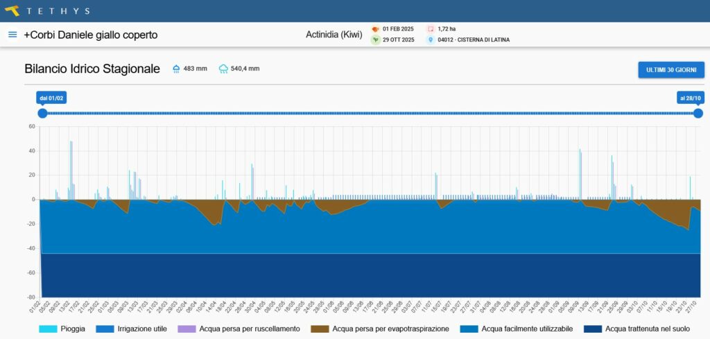 Durante il periodo compreso tra gennaio e marzo 2025, με Aqua è stata analizzata l’πραγματική εξατμισοδιαπνοή cumulata di un appezzamento di circa sei ettari dell’azienda Mauro Guzzo a Borgo Montello (LT), coltivato con kiwi Hayward Και privo di copertura antigrandine.