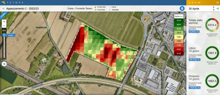 TETHYS CRECE risponde a questa esigenza offrendo un calcolo quotidiano della produzione di biomassa per ciascuna zona del campo. Questo significa avere, in tempo reale, una mappa dinamica che rappresenta la capacità produttiva dell’intero appezzamento.